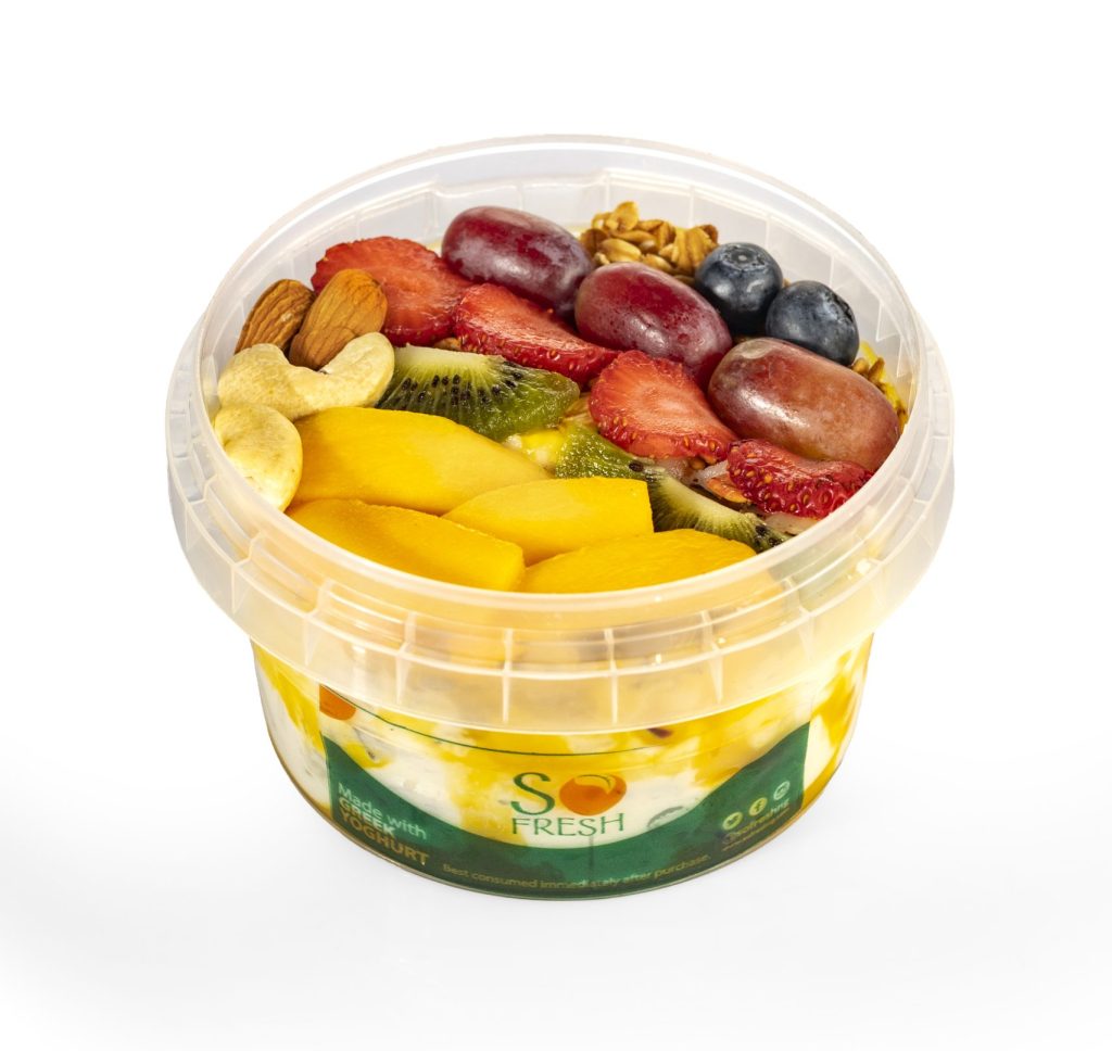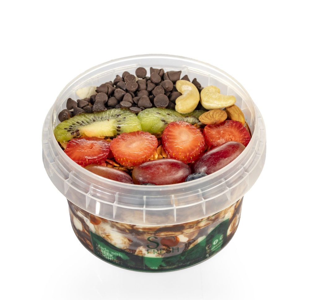 Roasted Coconut Flakes, Granola, Grapes, Kiwi, Strawberry, Blueberry, Almond, Cashew nuts, Apples, Mango chunks, Chocolate chips, Strawberry Puree/Mango Puree/Chocolate drizzle in Greek Yoghurt (UP TO 20% DISCOUNTS)